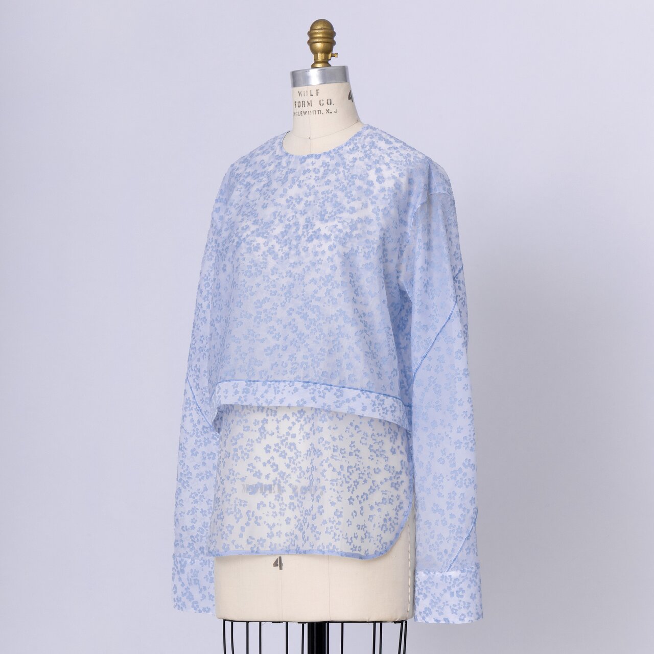 過去のアーカイブから大変ご好評をいただいたフラワープリントのブラウスを、今回特別に阪急うめだ本店限定カラーのブルーで復刻いたしました。