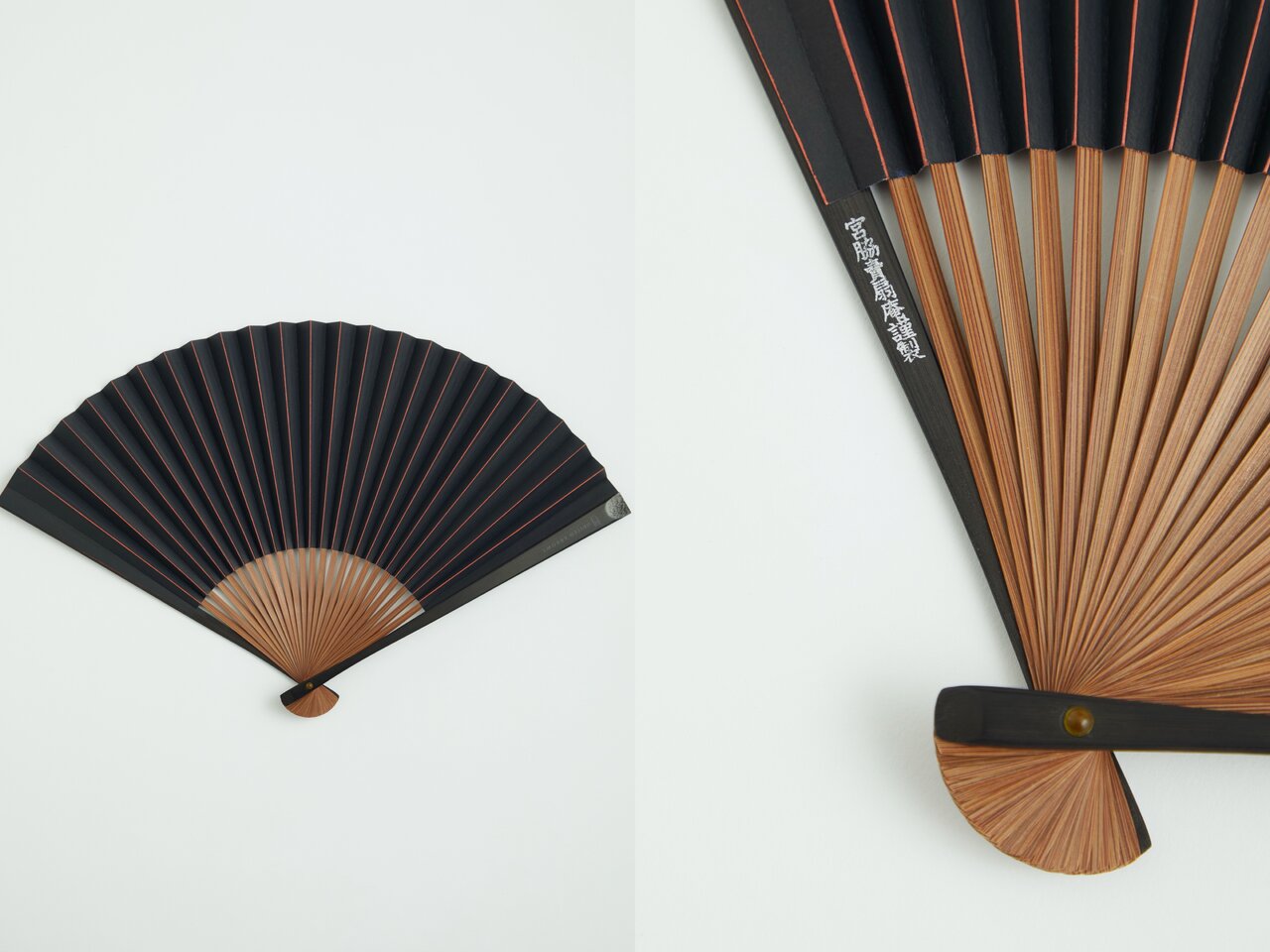 1823年創業の老舗、宮脇賣扇庵に色の組み合わせを指定した別注。コンセプトはドレススタイルに合う扇子。朱赤は扇子の歴史の中でも華やかで力強い色。日本画にも通ずる色の強さを感じる色。それをやや深みのあるシックな表情で表現頂き、スタイリングに馴染みやすいようにしています。