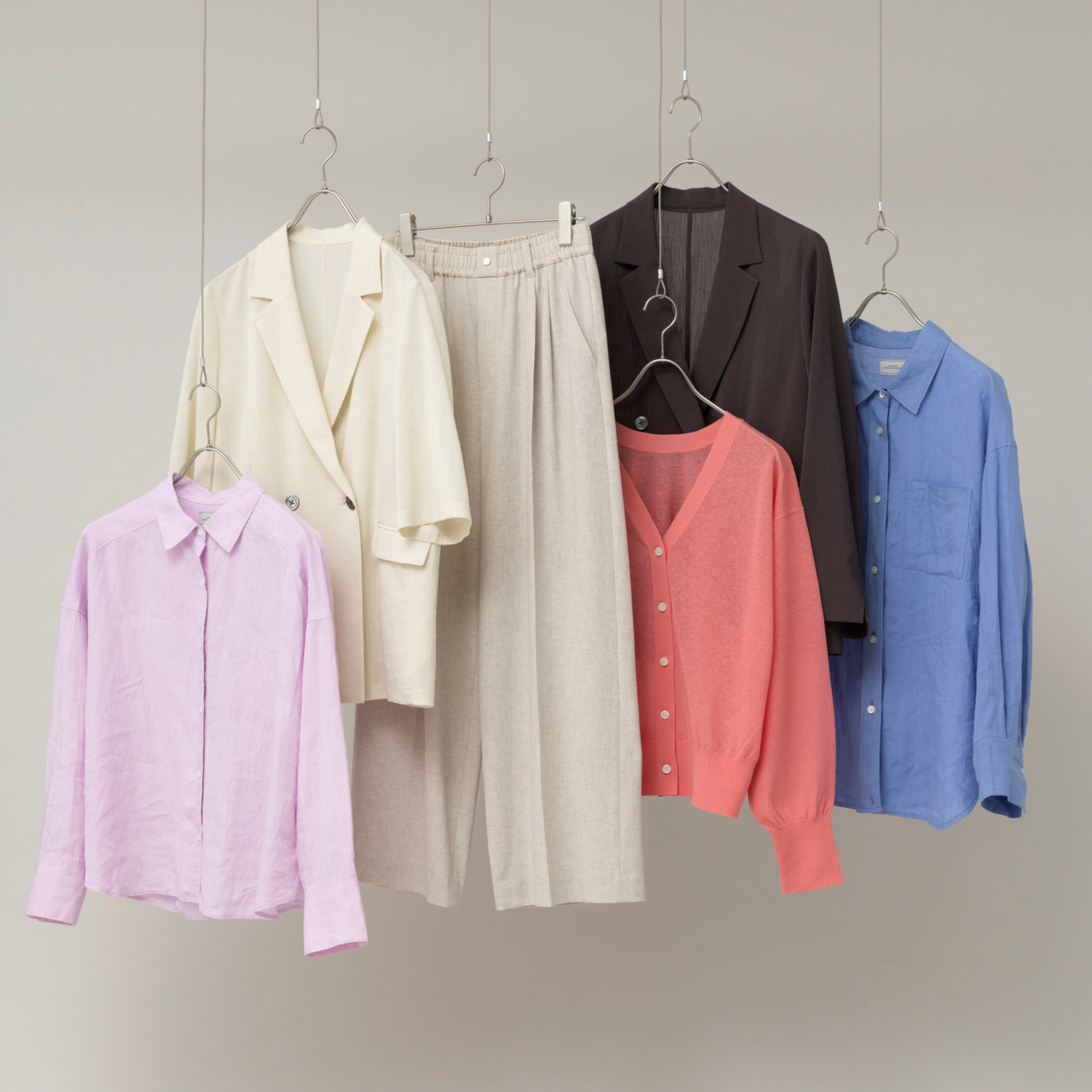 トップスの色はシーンごとに変化。豊富なカラーバリエーションに加え、光や風をまとうように洋服の印象が移ろう演出で、リネンならではの軽やかな素材感と、スタイリングが崩れにくいハリ感を表現しました。