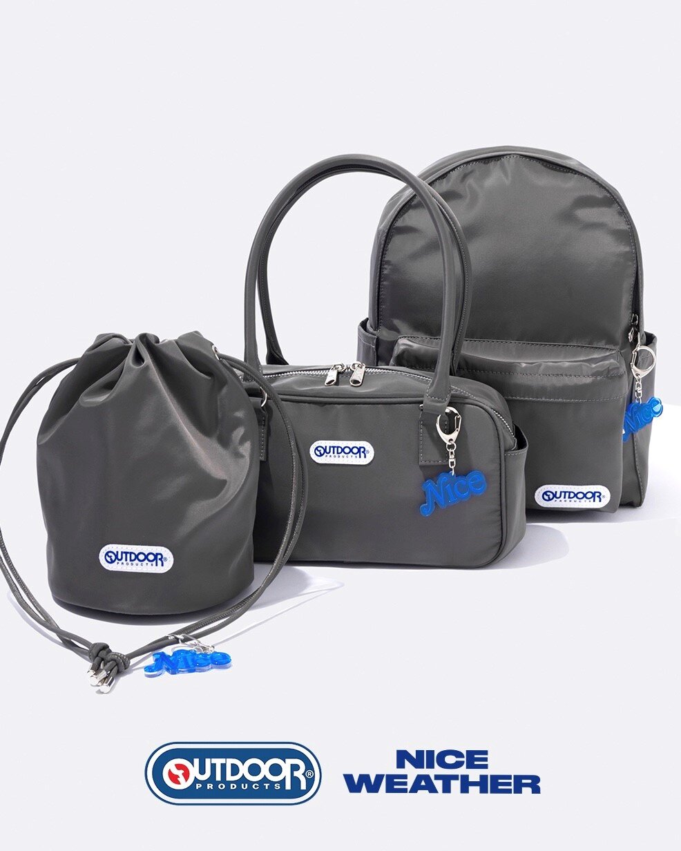 今回の札幌ポップアップに合わせ<OUTDOOR PRODUCTS>との別注バッグシリーズが発売となります。通常のインラインとは一線を画す、高密度に織り上げたナイロン素材を採用。カジュアルさをベースにしながらも、程よい光沢感が上品さをプラスし、洗練された印象に仕上げました。ラインナップは全3型。定番モデルをベースにサイズをコンパクトに再構築し、よりファッション性を高めたバックパック。現代のトレンドバランスに合わせてNICE WEATHERがオリジナルで制作したボストンバッグ。そしてスタイリングのアクセントにもなる巾着バッグ。各モデルには、遊び心のあるNICE WEATHERオリジナルキーホルダーが付属。アイキャッチーでありながら日常に溶け込む、特別感のある別注コレクションです。