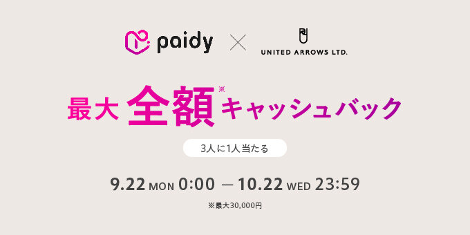 キャンペーン期間中にUNITED ARROWS ONLINE(自社ECサイト・アプリ)で「あと払い(ペイディ)」を選択し、3回あと払いを利用して3,000円以上購入すると抽選で3人に1人キャッシュバックが当たります。