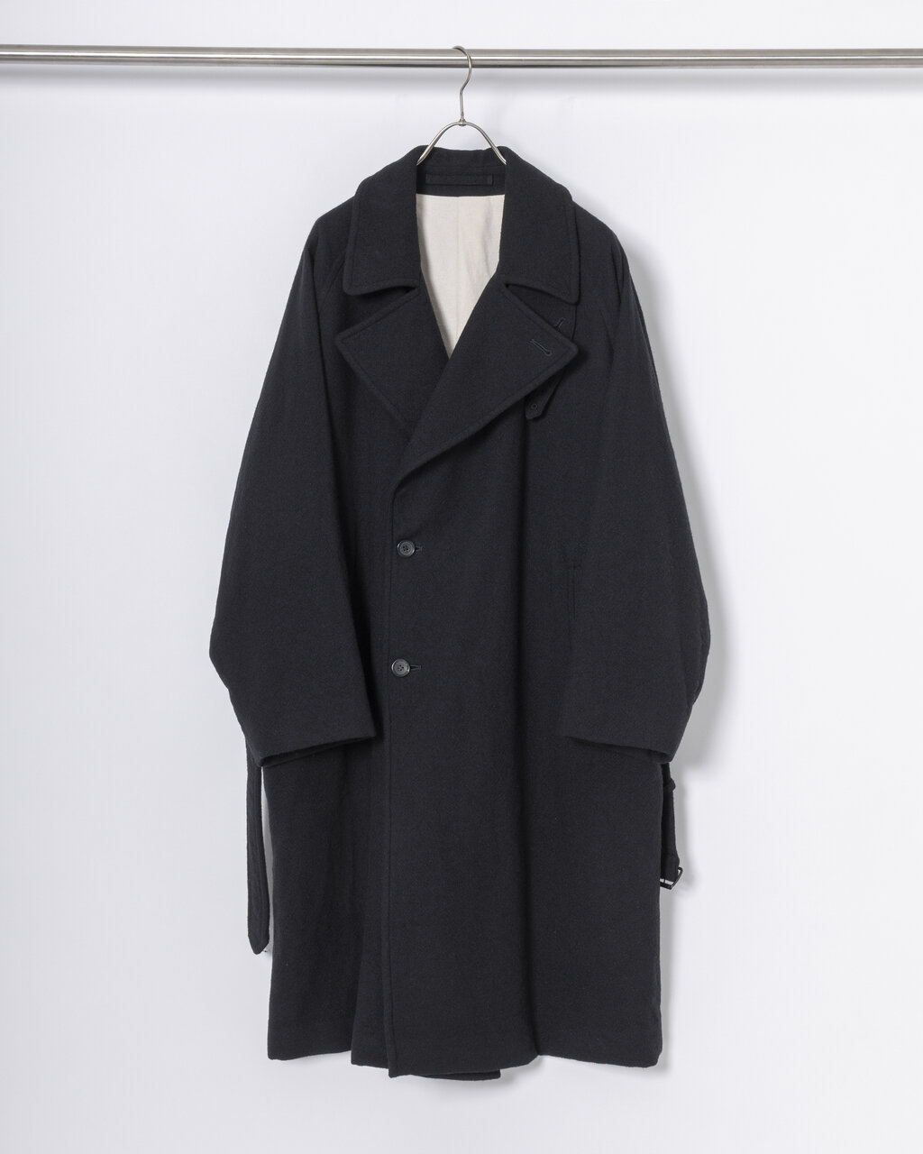 ビンテージのトレンチベースに<blurhms(ブラームス)>らしいサイズ感に落とし込んだコート。古着にあるような重厚感ある素材に変更し、真冬でも着れる仕様に。