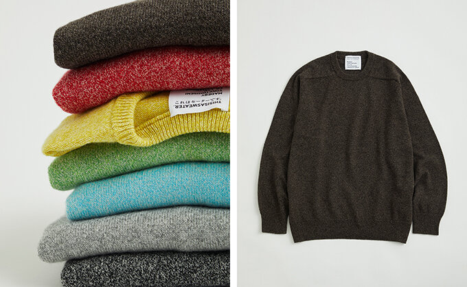 「セーターとは何か?(WHAT IS A SWEATER?)」を問い直し新たな価値を提案している<THIS IS A SWEATER.>。そのひとつの答え「A SWEATER IS COLOR.>として手掛けたカシミヤセーターを本イベントにて販売いたします。このセーターには、太さや色の異なる4本のミクロな糸を撚り合わせてつくった特別な杢糸が使用されており、非常に表情豊かな仕上がりとなっています。ダークブラウンはディストリクトの別注カラーです。