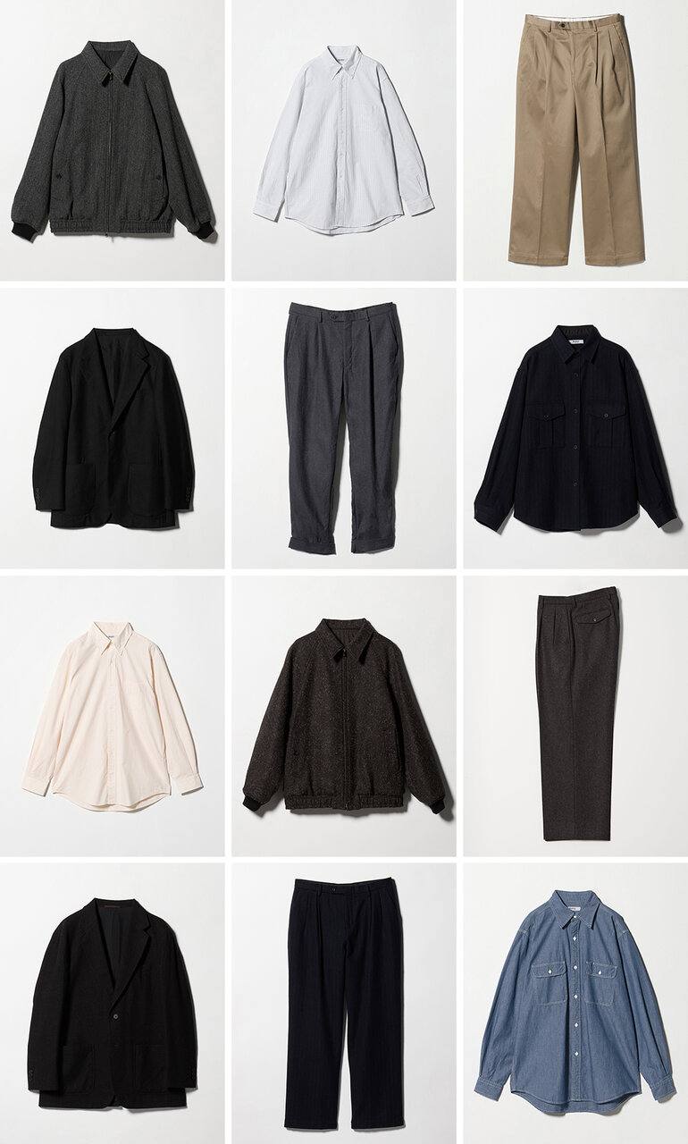 今季のコレクションの軸となったウォッシュドのセットアップシリーズをはじめ、タイドアップを想定したシャンブレーシャツ、6ボタン仕様のボタンダウンシャツ、かなりワイドなシルエットが特徴のチノーズやメルトンパンツ(11/20販売開始)など、ベーシックななかに少し癖のあるこだわりを詰め込んでいます。