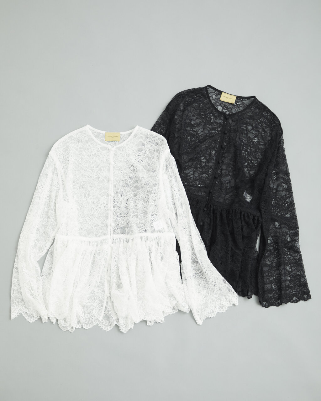 柔らかな素材感に加えてペプラム切替とギャザーによる程よい分量感が女性らしさを引き立てます。フロントのくるみボタンとループ仕様が繊細で上品な印象でカーディガンのように軽やかに羽織れます。ジャカード機で丁寧に編み上げたラッセルレース素材を使用しており、ナイロン糸による柔らかな風合いと美しいドレープ性もポイント。部分的に太番手のコードを織り込むことで、さりげない凹凸感と柄の陰影に奥行きをもたらしています。
