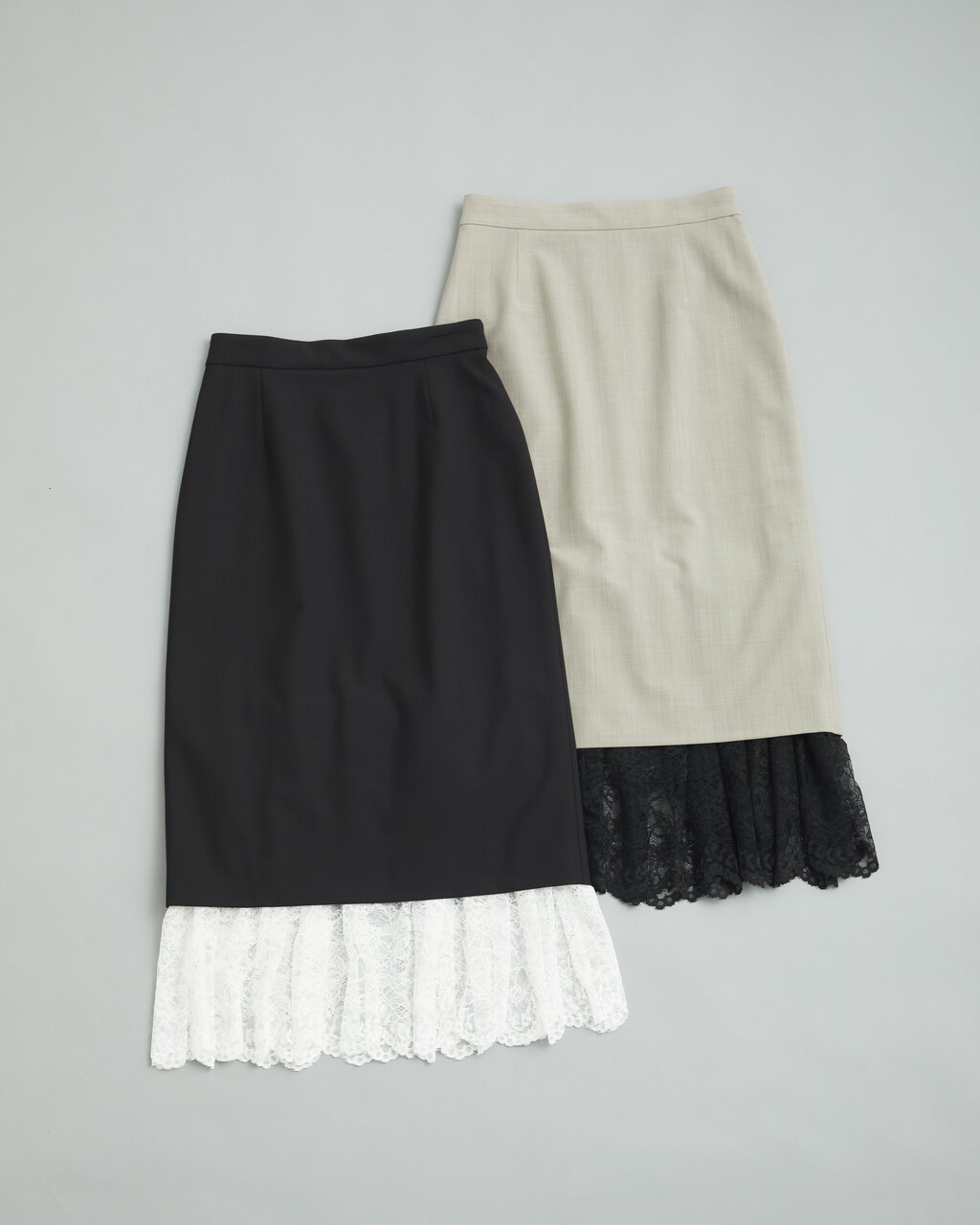 配色異素材コンビのタイトスカート。裾とベントから覗く繊細で柔らかなレースが歩くたびに揺れて女性らしい印象に。尾州産地で開発された毛羽の少ないTW素材を採用した上品な外観と発色性もポイント。裾部分には部分的に太番手のコードを織り込んだラッセルレースを組み合わせ、さりげない凹凸感と奥行きのある表情をプラスしました。