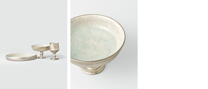 銀彩を施した谷井さんの陶器は、一つひとつ時間と手間をかけて手づくりされています。銀色は光と影を受け止め、静かに揺らめく時の表情を映してくれます。どこかアンティークを思わせる佇まいも魅力。使うたびに暮らしに馴染み、変化して味わいが深まっていきます。