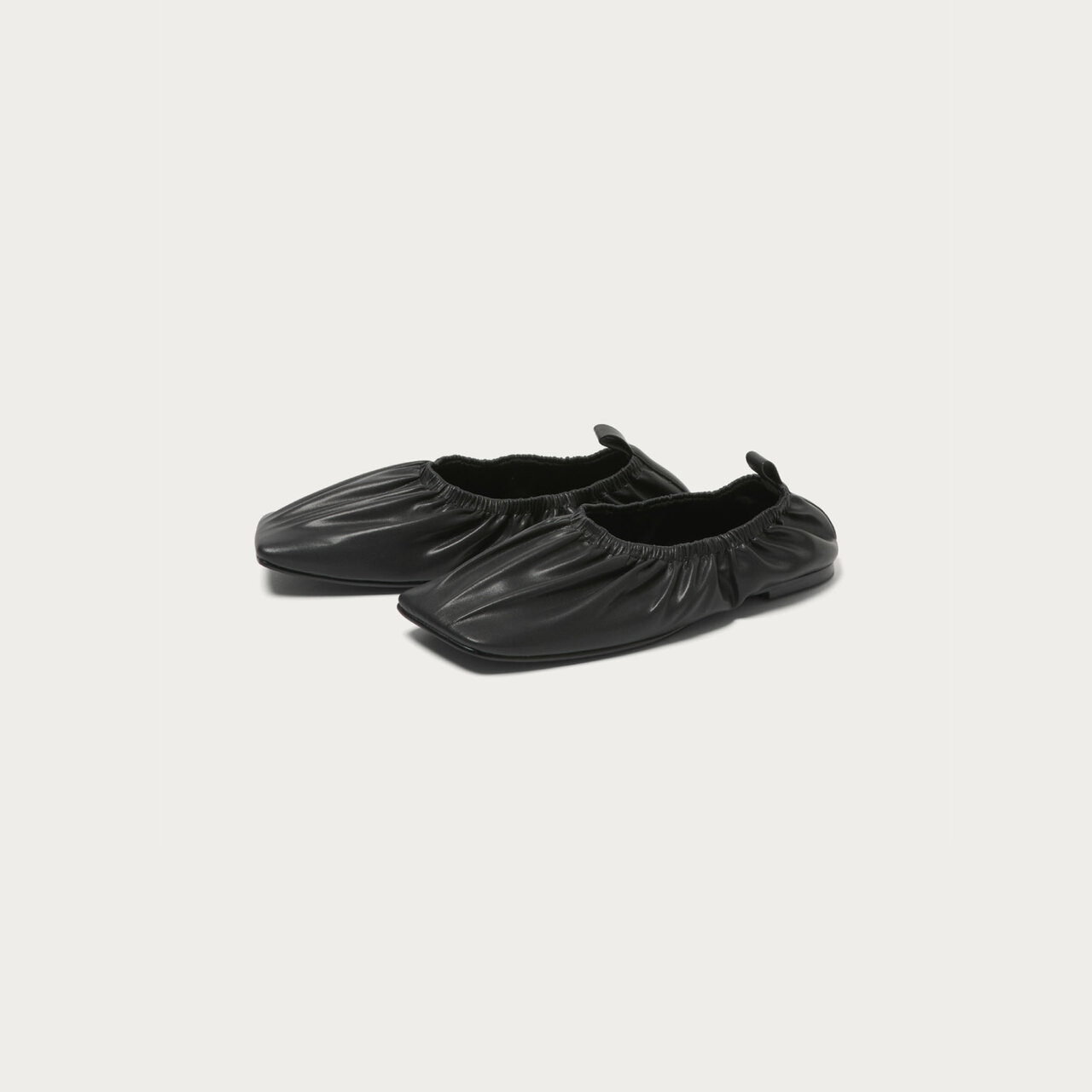 程よいスクエアのギャザーフラットシューズ。