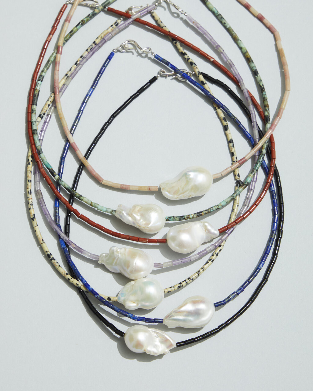 ブルー:ラピスラズリ、モノトーン:ダルメシアンストーン、ブラック:オニキス、全てFresh water pearl(淡水パール) , SLV925