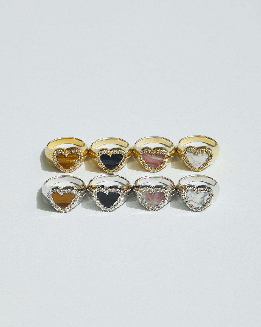 左からTiger eye , Hawkseye , Pinkopal , Howlite,全てDiamond , SLV925 , SLV925+K18 YG plating.