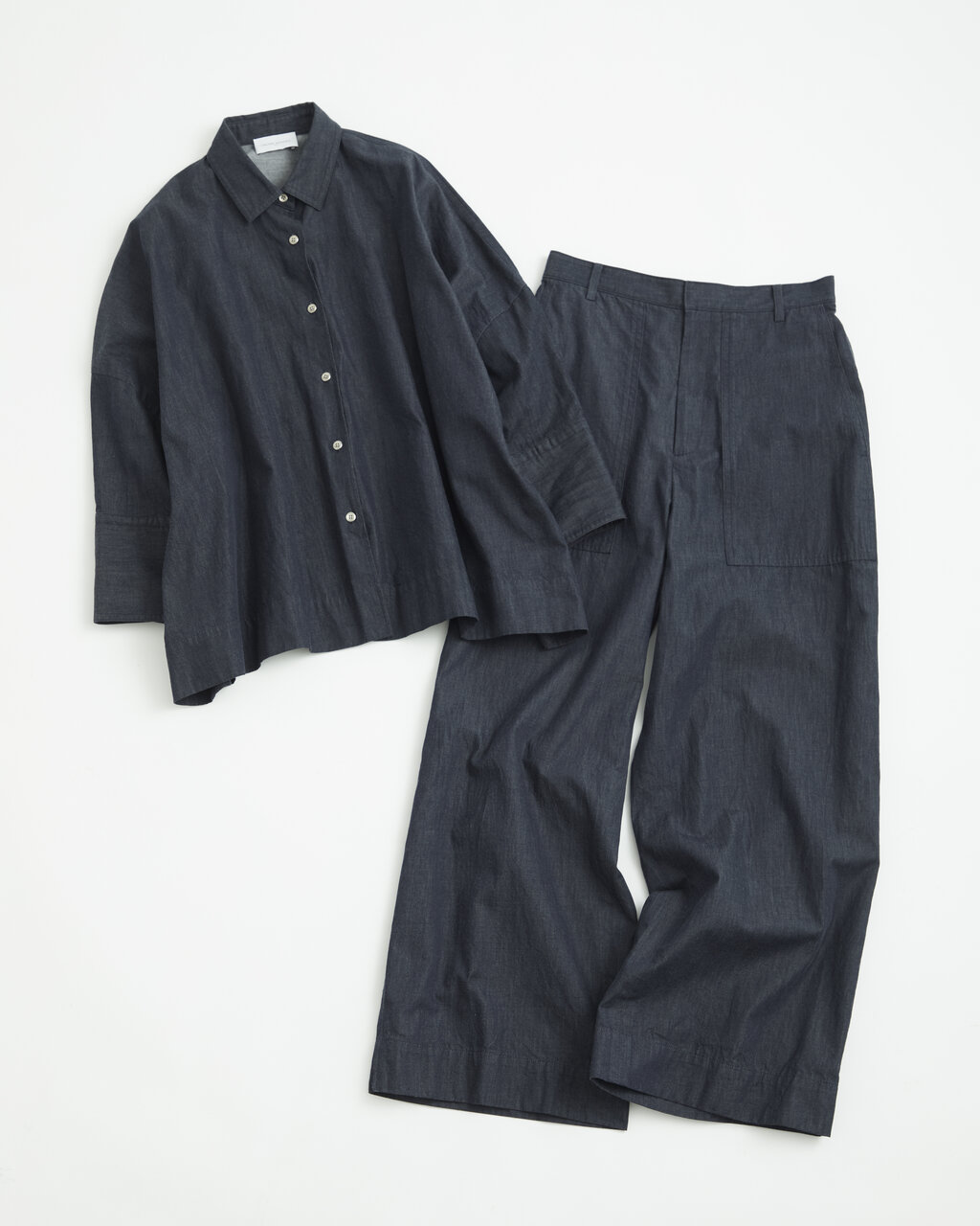 ドルマンスリーブの八分袖は、長めのカフスを折り返して肘下の長さで着用することもでき、シーズン長くご活用いただける一枚です。インディゴ調の素材ですが、カジュアル過ぎないのがポイントです。