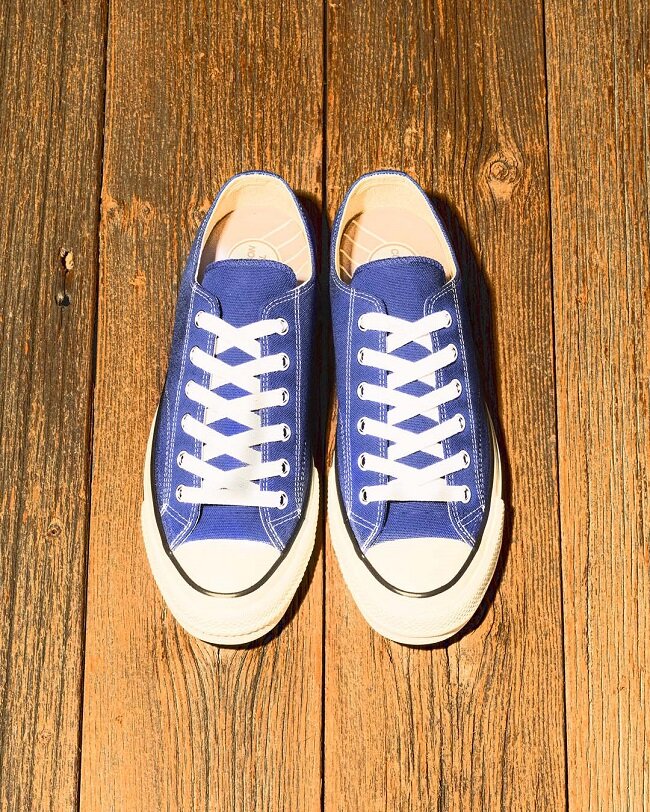 国産シャトル織り機で紡いだ風合い豊かな鮮やかなブルーキャンバスを使用。1960年代のALL STARに見られる三ツ星ヒールラベルやサイドステッチ、ソールの糊のはみ出しなど当時のディテールを再現。クッション性に優れたE.V.A.と「PORON®」の2重構造に加え、安定した歩行をサポートするTPUシャンクを組み合わせたカップインソール、防滑性と耐摩耗性に優れ全天候に対応し「HIGH PERFORMANCE RUBBER COMPOUND」の「VIBRAM® MEGAGRIP」ソールなど、ハイスペックな機能を搭載し快適な履き心地を実現。