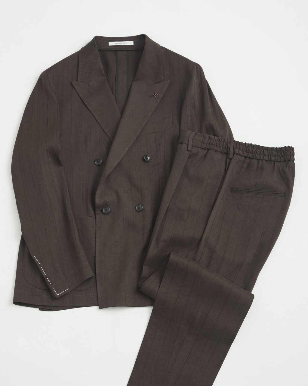 軽やかな仕立てと洗練されたデザインで人気を集めるモデル「グレン」。今季のトレンドカラーであるブラウンを基調とした、麻×レーヨンの混紡素材を使用したストライプ柄セットアップスーツを限定で発売いたします。ナチュラルな風合いとさらりとした肌離れのよさが魅力で、暑い季節でも快適に着用できる一着です。