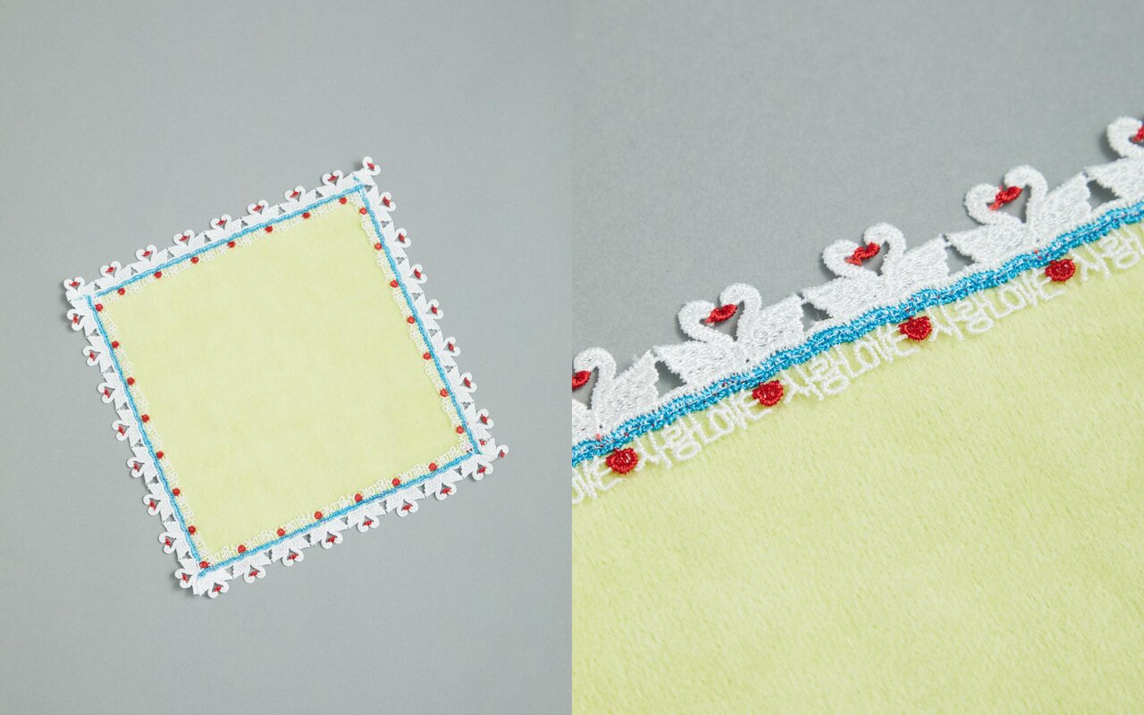 向かい合い赤いくちばしを寄せ合う白鳥の姿がロマンチックなレース。水面下には「LOVE」と韓国語の「サラン(愛)」の文字が入っています。ライムカラーは大丸京都 ウィメンズストアの限定カラーです。