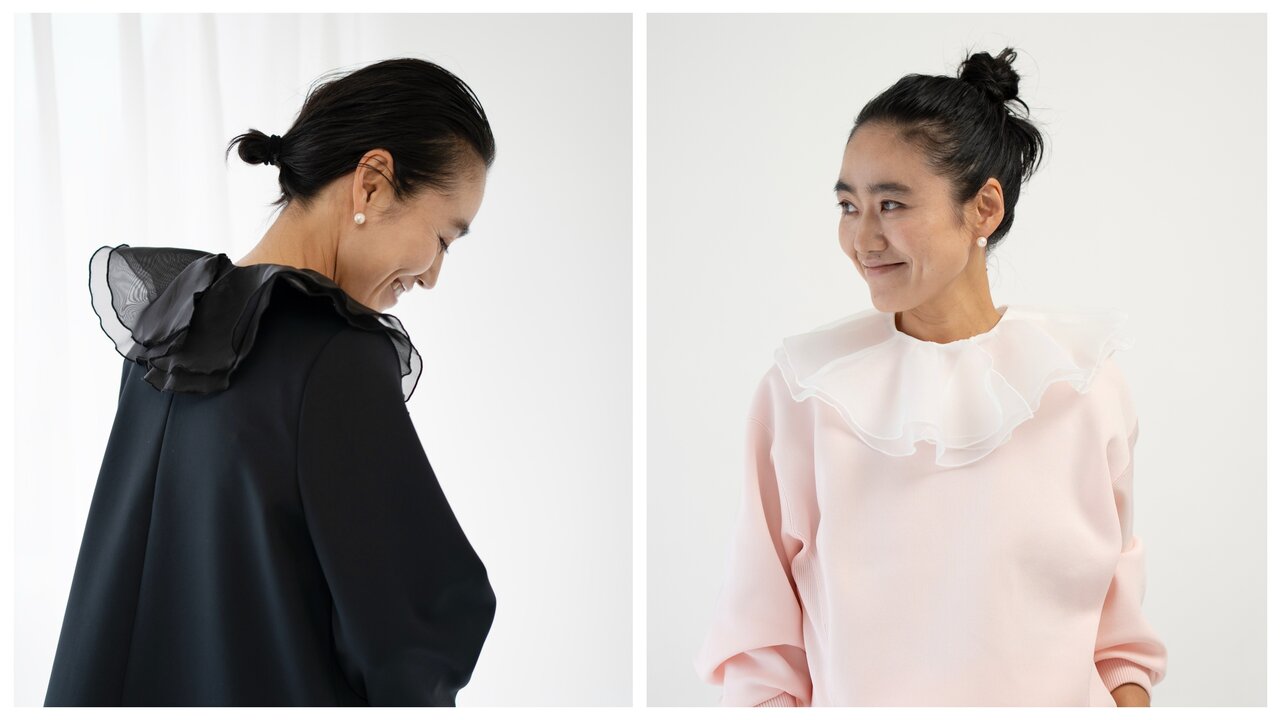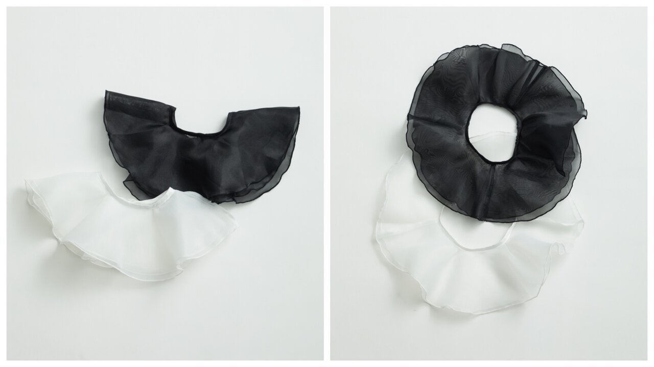 ひらひらと軽やかなオーガンジー素材のつけ襟。どの角度から見ても立体的に見えるふんわりとした大きめのラウンドシルエットが華やかな印象を演出します。オーガンジーは2枚重なっており透け感があるのでどんなコーディネートでも馴染みやすく、背面は2段階ホック仕様で首まわりの調整が可能です。ホワイト・ブラックの2色展開。