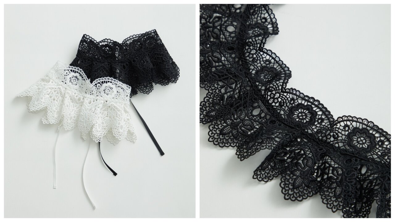 異なる2種類のレースを組み合わせたレースのつけ襟。華奢なリボンで結ぶ仕様で、結び目を背面にまわすとすっきりとした印象に。つけ方次第でアレンジができ、結び目を前後に、レースを上下で使用したり、折り込んだりと着用するアイテムによって楽しめます。ホワイト・ブラックの2色展開。