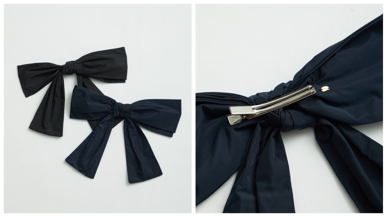 タフタ素材で仕立てた、ボリュームのあるリボンクリップ。クリップ式で簡単に装着が可能で、後頭部につけても前から見えるサイズ感ですが、ソフトな素材感のため大げさになりすぎず軽くつけられます。リボンの形は、ピンと立たせたり落ち感を出したりと調整でき、スタイリングに合わせて表情を変えられます。ネイビー、ブラックの2色展開です。