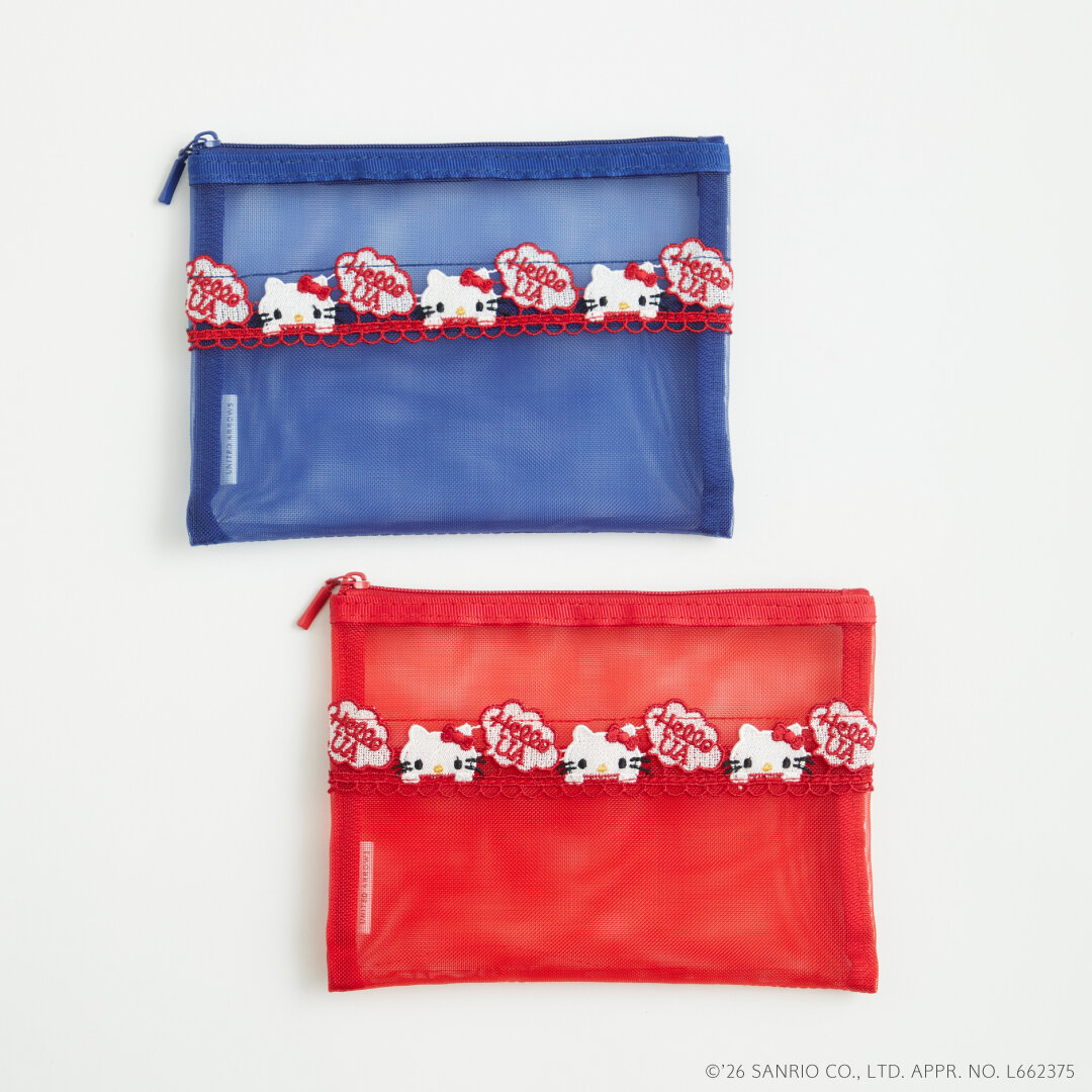 <近沢レース店>で定番のメッシュ小物シリーズより、70年代をイメージしたハローキティを繊細なレースで表現したミニポーチ。小物類を持っておくのにぴったりなダブルファスナーの仕様で、2か所に分けて収納可能です。ビビッドな赤、青のメッシュと、かわいらしいハローキティの刺繍がアクセントになったアイテムです。