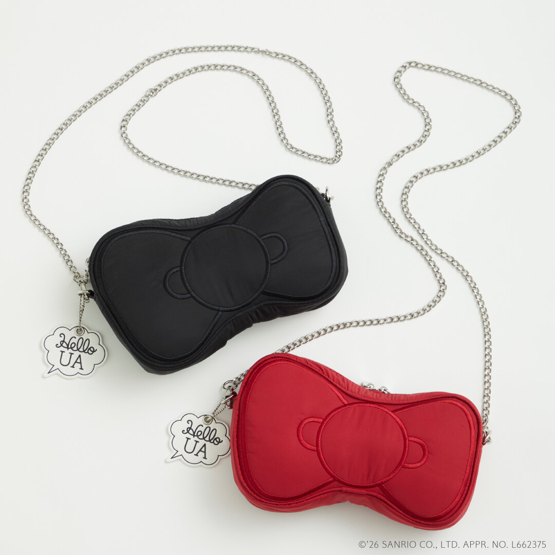 ハローキティのトレードマークのひとつであるリボンをショルダーバッグにしました。お出かけに必要なアイテムが収まる容量は確保しつつ、リボンのかわいらしいフォルムを活かしたミニサイズのバッグに仕上げています。ショルダーチェーンは取り外しができるので、ポーチやバッグインバッグとしてもお使いいただけるアイテムです。ハローキティとUNITED ARROWSのコラボレーションのためにデザインした「Hello UA」吹き出しモチーフのチャームがついています。