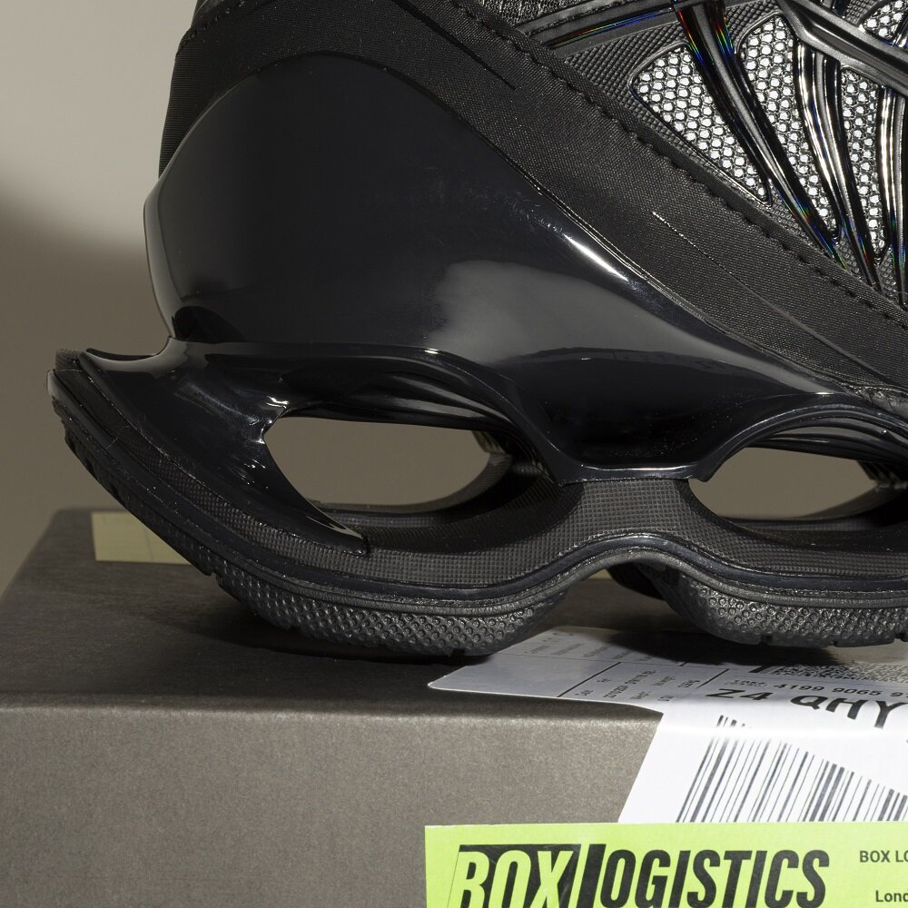 ブランドの特徴的なアプローチはアッパーの近未来的なデザインにも現れています。リップストップ生地やハイグロスな素材使いは工業製品のように見えるし、さらにGORE-TEXが搭載されていたりと、実用性が考え抜かれている。コーディネート力が試される、存在感の強いモデルですが、ソリッドな白シャツと黒いスラックスと合わせてもいいバランスになるのではないでしょうか。