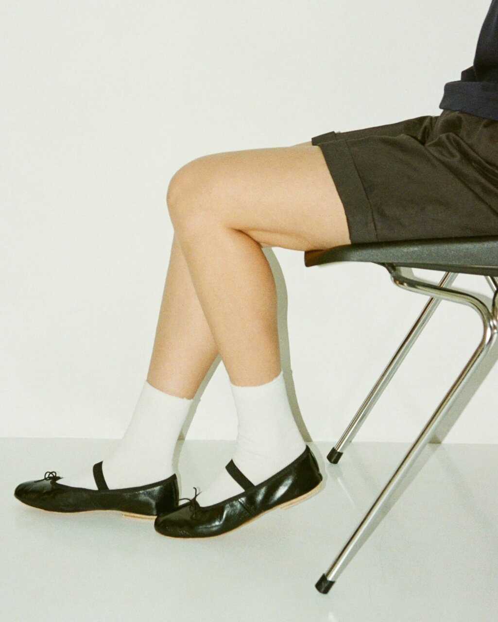 現在ファッションアイテムとして語られるバレエシューズは、前者のバレエシューズをモチーフに屋外で履けるようにアウトソールを付けたもので、フランス語ではバレリーヌ、バレリーナシューズとも呼ばれる。愛らしいディテールはダンスのための機能性から生まれたもの。甲にある紐の小さなリボンは、元々は縁を囲むグログランテープの中にぐるりと一周入れてフィット感を調整できるように付けられた。同じくゴムバンドを残したデザインもクラシックな佇まいがある。