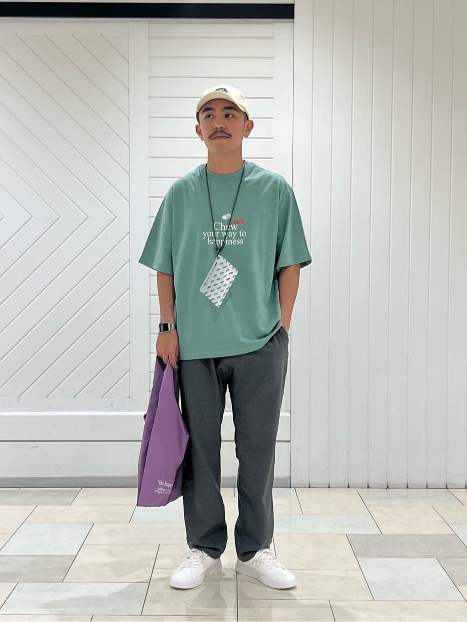 ライムグリーン×パープル×グレーのポップな色選びで遊び心たっぷりなスタイル。ほどよくゆとりのあるシルエットが抜け感を演出し、大人の余裕を感じさせます。