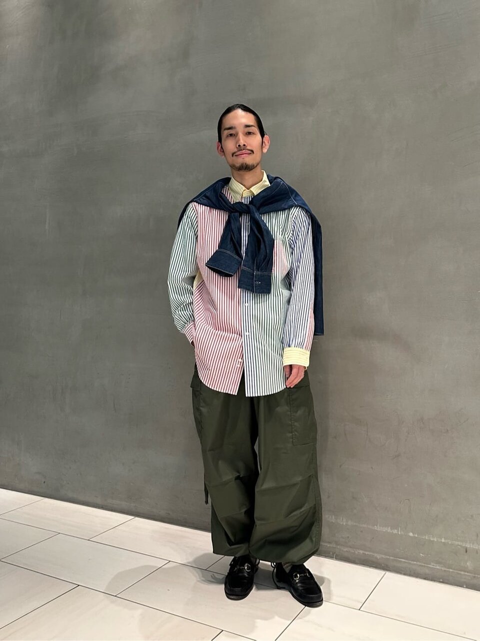 ワイドパンツにインパクト強めのシャツをあわせました。個性的なコーデですが、デニムシャツを肩掛けすることで落ち着いた印象になります。